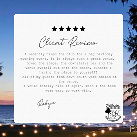 Hire includes Clubhouse licensed bar & balcony and observation deck & lawns for your exclusive use.